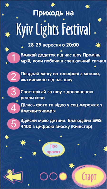 मानव जाति के इतिहास में पहली बार, 100,000 बच्चों के सपने अंतरिक्ष में उड़ेंगे। भव्य आयोजन का दृश्य 28-29 सितंबर को 20:00 बजे यूक्रेन की मुख्य सड़क पर होगा। आओ और अद्वितीय कार्रवाई देखें। और भी अधिक चमत्कार देखने के लिए, मुफ्त प्रोमिन मेरी मोबाइल ऐप डाउनलोड करें और फिर एक विशेष छवि पर अपने फोन कैमरे को इंगित करें जो इमारत पर दिखाई देगा और अपने बचपन के सपनों को संवर्धित वास्तविकता में जीवन में आएगा!