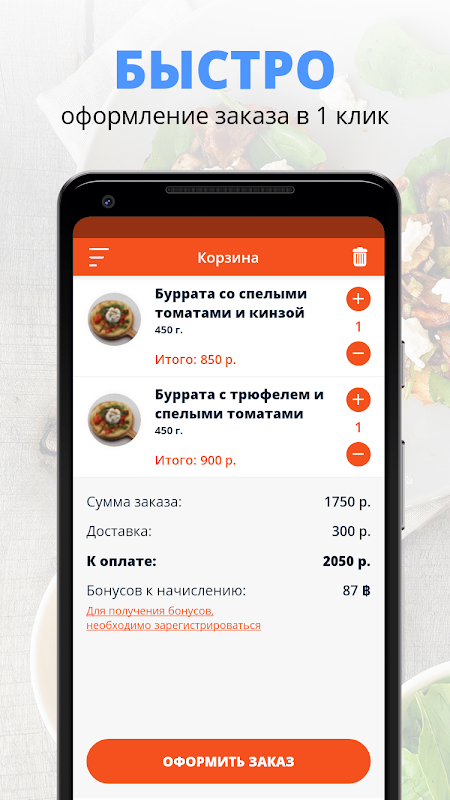 हमारे आवेदन की मदद से, आप वोलोग्दा में डिलीवरी के साथ बुर्राटा रेस्तरां से तैयार भोजन का ऑर्डर कर सकते हैं।