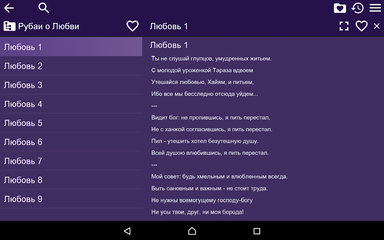 यह हैंडबुक है - "उमर खय्याम की Rubaiyat." उमर खय्याम - 11-12 वीं शताब्दी में रहते थे जो एक प्रसिद्ध फारसी दार्शनिक, कवि, गणितज्ञ, खगोलशास्त्री,. उनका Quatrains "Rubaiyat" दुनिया भर में और हमारे दिनों में प्रासंगिक रहेगा. जीवन के बारे में, भगवान के बारे में, प्यार के बारे में, शांति, खुशी, और दूसरों के बारे में - हमारी निर्देशिका में आप विभिन्न विषयों पर Rubaie मिलेगा.