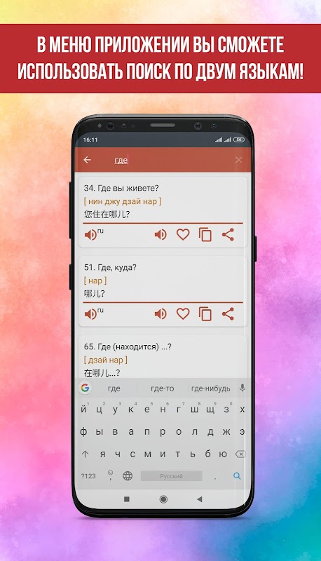 Разговорник также поможет вам в изучении и усовершенствовании языка: фразы возможно сохранять в разделе «избранные» для быстрого доступа и дальнейшей практики произношения.
