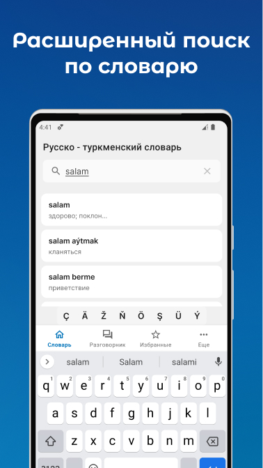 एक ही समय में दो भाषाओं में आपके लिए आवश्यक शब्द को तुरंत ढूंढने के लिए एक खोज फ़ंक्शन है। आपको रूसी - तुर्कमेन या तुर्कमेन - रूसी चुनने की ज़रूरत नहीं है। खोज में रूसी और तुर्कमेन दोनों में शब्द दर्ज करें।