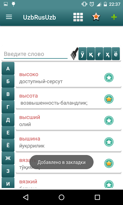 * Есть возможность добавления нужных или интересных слов в закладки। Доступ к ним возможен из одноименного пункта меню।