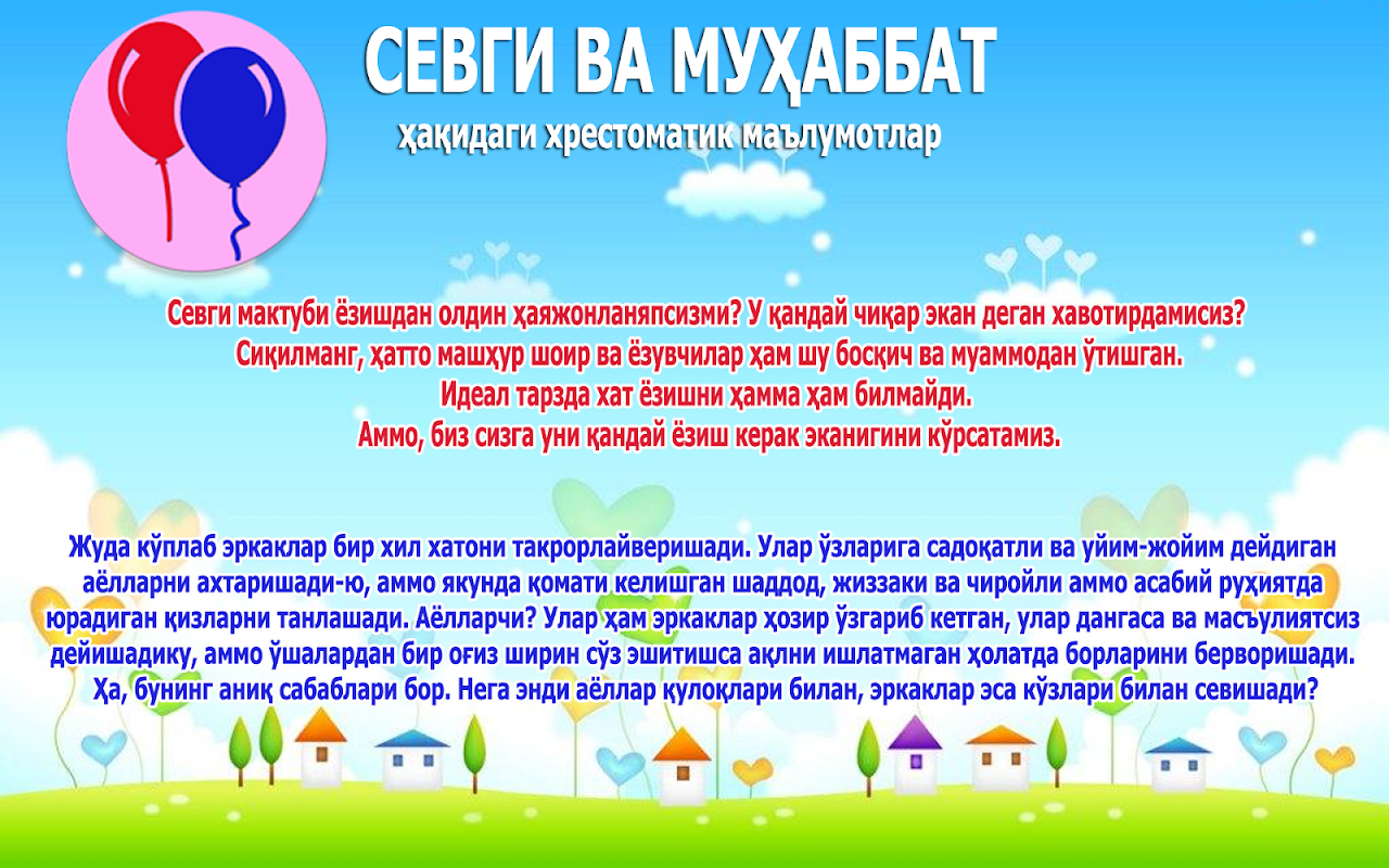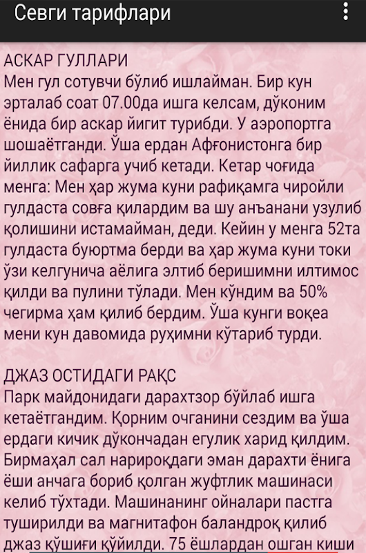 Мазкур илова орқали сиз севги ва муҳаббат бобида кўп нарсаларни билиб оласиз. Севги ҳақида шеърлар, афоризмлар, маълумотлар.