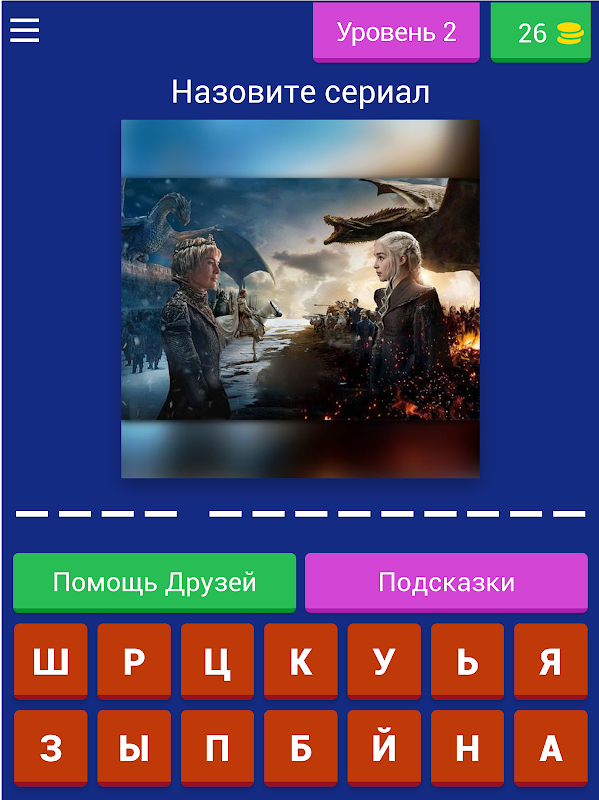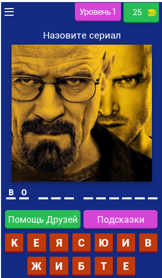 В игре «Сериалы ТОП 50 - Тест о Лучших Сериалах» есть система подсказок, она позволит вам пройти уровень с сериалом, название которого вы не знаете или не можете вспомнить.