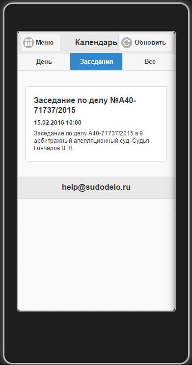 Есть возможность вести календарь юриста, календарь адвоката, календарь судебных заседаний, список поручений, работать совместно с другими юристами.