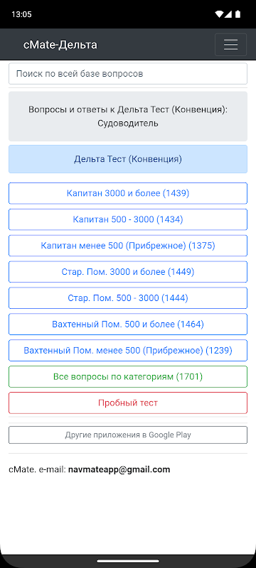 एप्लिकेशन में डेल्टा टेस्ट के नवीनतम संस्करण के प्रश्नों और उत्तरों का एक डेटाबेस है (डेटाबेस SKI कन्वेंशन प्लस की तैयारी के लिए प्रासंगिक है)। सभी प्रश्नों को श्रेणियों में विभाजित किया गया है (कप्तान, मुख्य अधिकारी, निगरानी अधिकारी)