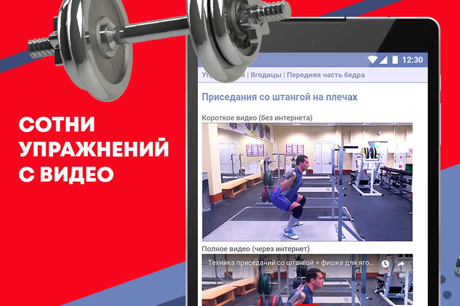 वर्तमान में, एप्लिकेशन में जिम और घर पर लगभग 230 व्यायाम शामिल हैं। सभी अभ्यासों में पूर्ण वीडियो (इंटरनेट के माध्यम से) और लघु वीडियो दोनों होते हैं जिन्हें आप इंटरनेट तक पहुंच के बिना देख सकते हैं।