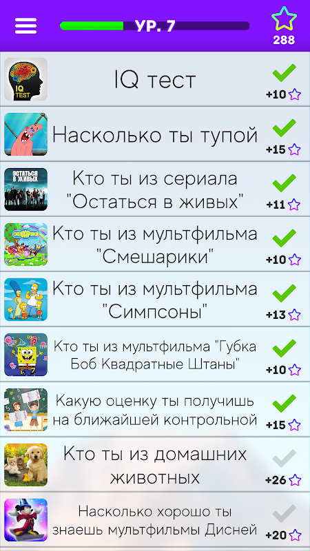 उन परीक्षणों का चयन करें जो आपके लिए अधिक दिलचस्प हैं या अपने आप को बेहतर पता लगाने के लिए उन सभी को पास करें! अपने दोस्तों और परिचितों को परीक्षा पास करने की पेशकश करें, और आप निश्चित रूप से उनके बारे में कुछ नया सीखेंगे!