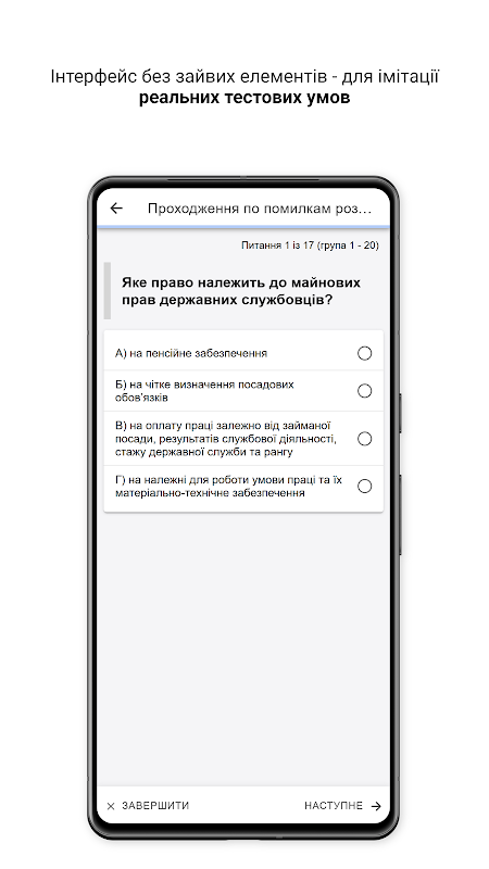 सिविल सेवक श्रेणी "ए", "बी", "बी" की रिक्त स्थिति के लिए प्रतियोगिता के लिए परीक्षण कार्यों पर उच्च गुणवत्ता वाले प्रशिक्षण के लिए एक अद्यतन सिम्युलेटर, सिविल सेवा के लिए यूक्रेन की राष्ट्रीय एजेंसी के आदेश द्वारा अनुमोदित (परिवर्तन के साथ) एनएडीएस के आदेश द्वारा बनाई गई) "उत्तर के विकल्पों के साथ कानून के ज्ञान पर परीक्षण प्रश्नों की सूची"।