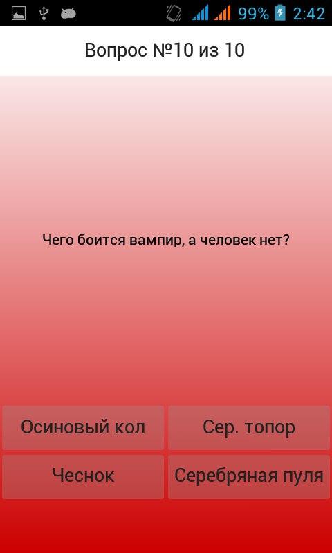 Данное приложение, созданное в виде теста, поможет дать ответ на извечный вопрос: "Насколько ты вампир?" Ответив на 10 простых шуточных вопросов, Вы получите процентный результат. Если на вашем устройстве названия кнопок умещаются не полностью, переверните устройство в альбомный режим. Данное приложение несет развлекательный характер.