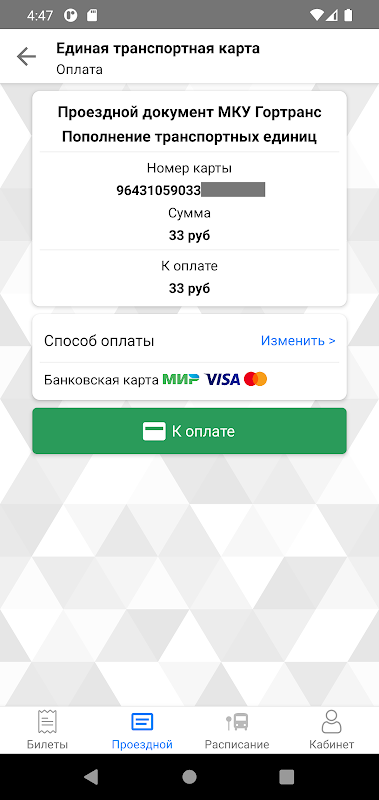मोबाइल एप्लिकेशन "ट्रांसपोर्ट कार्ड परमिट" पर्म शहर के एकीकृत परिवहन कार्ड के उपयोगकर्ताओं के लिए बनाया गया था और आपको आसानी से और आसानी से कनेक्टेड सेवाओं की सीमा और वैधता अवधि की जांच करने, परिवहन सेवा को सक्रिय करने, कार्ड बैलेंस को ऊपर करने, देखने की अनुमति देता है। यात्राओं और टॉप-अप का इतिहास।