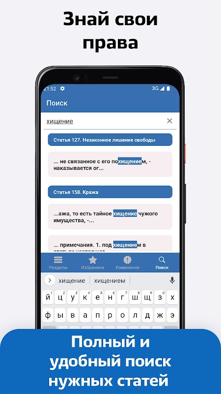 एप्लिकेशन 2025 के लिए रूस के आपराधिक संहिता के वर्तमान लेखों तक पूर्ण पहुंच प्रदान करता है।