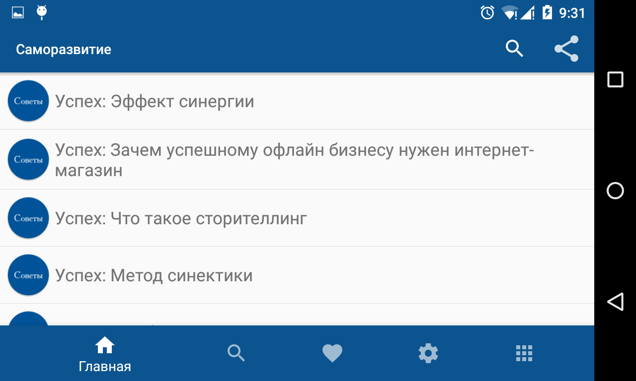 В этом приложении собраны лучшие материалы: Успех, Истории успеха, Саморазвитие, Карьера, Здоровье, Финансы, Образование и обучение, Сила мысли, Психология, Афоризмы. Из приложения вы узнаете о саморазвитии, личностном росте, таланте.