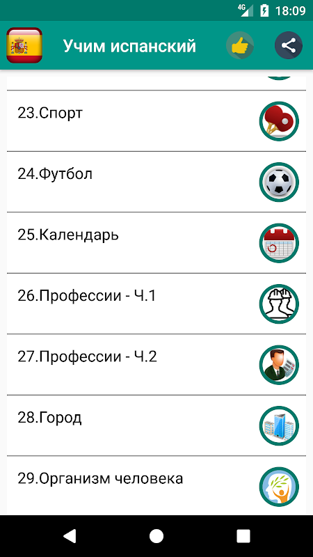 सरल और सुविधाजनक कसरत मोड। अपनी रुचि के विषयों खोलें, शब्दों को जानने के। जब फैसला अपने आप को जांच में शीर्ष निशान पर सेट "रूसी" में रूसी केवल शब्दों के रूप में यदि आप के सामने एक ट्यूटोरियल या एक रूपरेखा बना रहेगा, और आप हाथ अपने आप को जांच करने के लिए अनुवाद बंद कर दिया। आप एक शब्द का अनुवाद कर सकते हैं? बहुत बढ़िया, अगले करने के लिए आगे बढ़ें। आप हस्तांतरण या शक नहीं कर सकते? - लाइन पर क्लिक करें जहां सही शब्द नहीं है और आवेदन शब्द का अनुवाद खुल जाएगा। इसी तरह, में "स्पेनिश" एक जाँच चिह्न जगह - स्पेनिश और प्रतिलेखन में सिर्फ शब्दों रहते हैं। शब्द सीखने के लिए एक और उपयोगी सुविधा: विषय के शब्दों में यदि आप "साधा" क्षेत्र में अपनी छाप डाल एक यादृच्छिक क्रम में प्रदर्शित किया जाएगा।