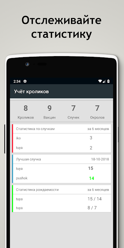 पालतू जानवर के बारे में सभी महत्वपूर्ण जानकारी, अपने माता-पिता के बारे में डेटा, प्रत्येक खरगोश के लिए टीकाकरण लेखांकन और भविष्य के टीकाकरण पर अद्यतन स्थापित करने, चयनित मापदंडों के आधार पर खोजें, संभोग और जलना के बारे में जानकारी!
