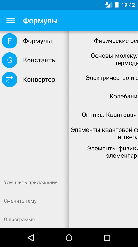 PhysicsHelper+ - программа, с помощью которой Вы сможете вспомнить формулы по физике, посмотреть физические константы, а также произвести перевод единиц измерения в единицы СИ.