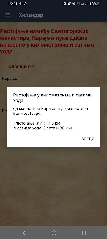 यहां, उपयोगकर्ता को आसानी से और जल्दी से मठ की दूरी और गंतव्य से गंतव्य तक पहुंचने में कितने घंटे चलने की आवश्यकता है, यह स्थापित करने का अवसर दिया जाता है। मेनू से एक साधारण चयन गंतव्य और गंतव्य का चयन करता है और शो बटन पर क्लिक करता है। (स्वेता गोरा एटोंस्का पुस्तक से - माउंट एथोस के मठों की दूरियों की एक तालिका, जो किलोमीटर और पैदल चलने के घंटों में व्यक्त की गई है)।