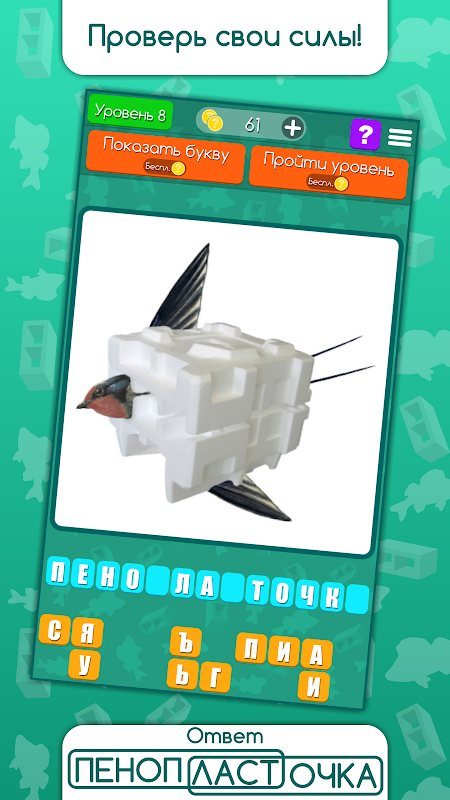 उदाहरण के लिए: - बसेरा है और इस विषय - राख ब्लॉक चित्र की मछली एक संयोजन से पता चलता है। इन दो शब्दों के संयोजन से और जवाब 'Shlakoblokun' मिलता है!