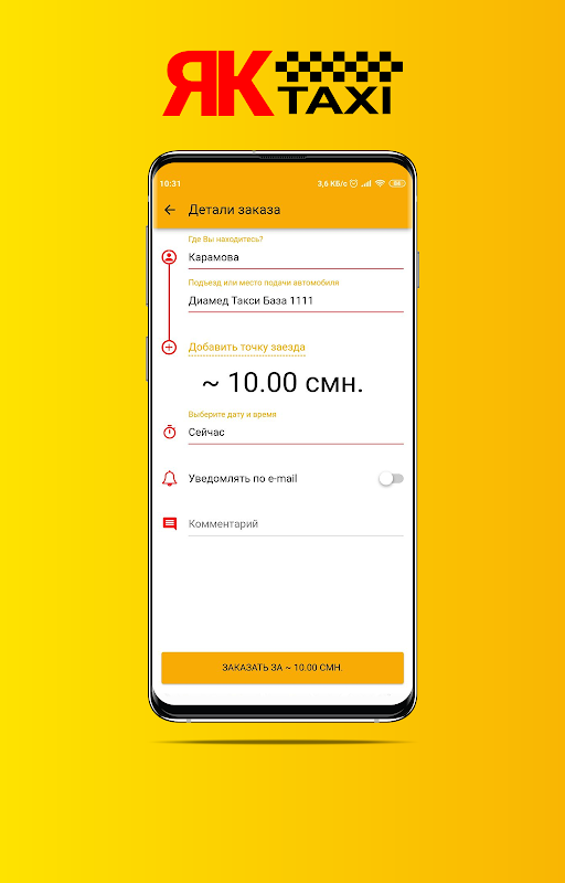 Достаточно только открыть приложение «Як Taxi» и он сам определит ваше местоположение а вам остаётся лишь кликнуть - Заказать 🚕
