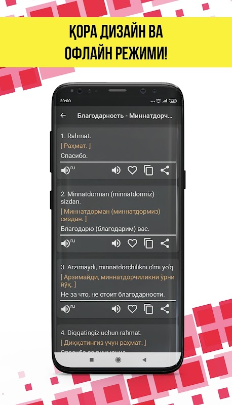 ❤️Сӯзлашгич тилни ӯрганиш ва яхшилашга ёрдам беради: тезкор кириш ва талаффуз қилиш учун ибораларни "севимлилар" бӯлимида сақлаш мумкин.