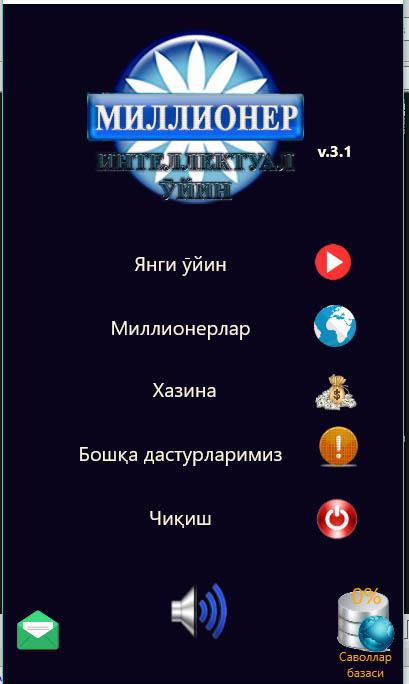 Ӯзбекча миллионер. Бутун дунёга машҳур бӯлган Миллионер дастурининг ӯзбекча варианти. Марҳамат олинг, ишлатиб кӯринг, камичиликларини биргаликда оҳиста оҳист тӯғрилаб борамиз ва ИншоАллоҳ ушбу дастурни янада ҳам қизиқарли ва фойдали бӯлишига ҳаракат қиламиз.