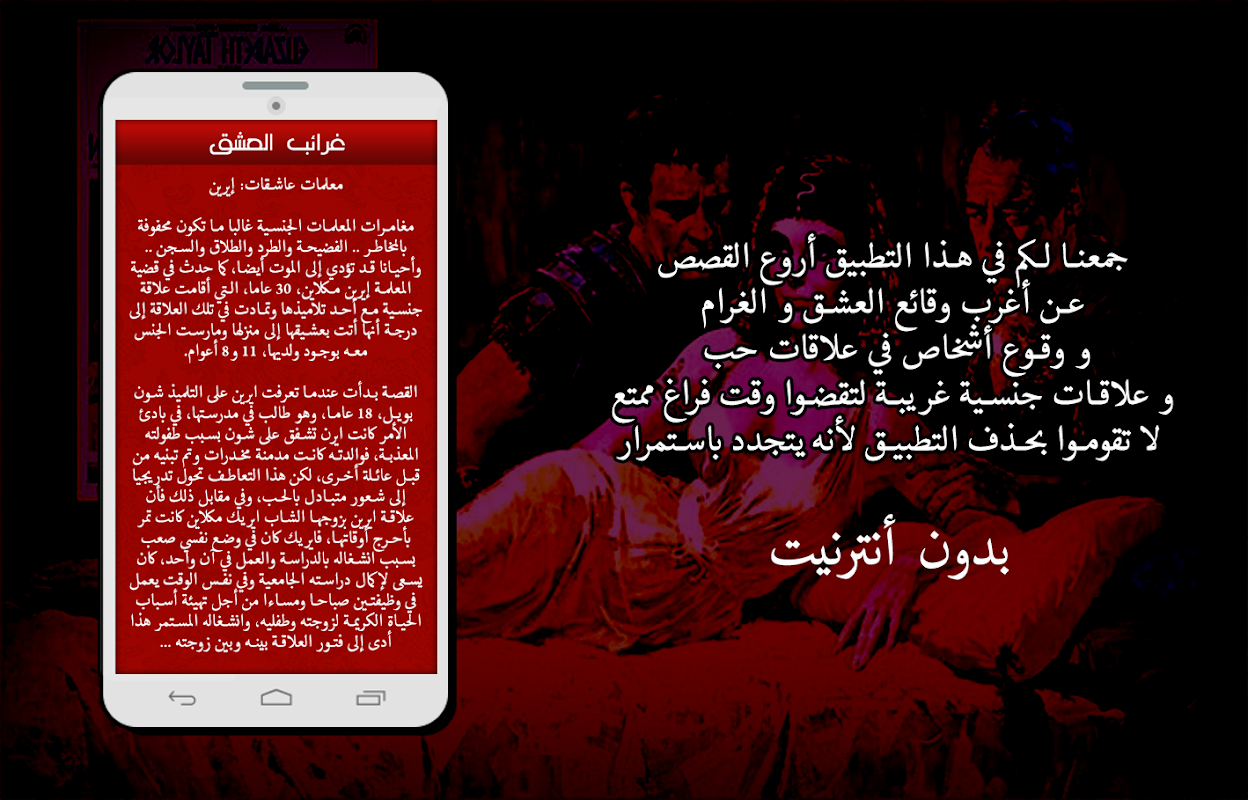 مرحبا بكم في هذا التطبيق الجديد و المتقن التصميم و الرائع الذي سيبهركم بالمحتوى الذي وضعنا فيه و الفريد من نوعه من اجلكم و من اجل ثقافتكم و تنوير عقولكم بأغرب قصص العشق و الغرام بدون أنترنت.