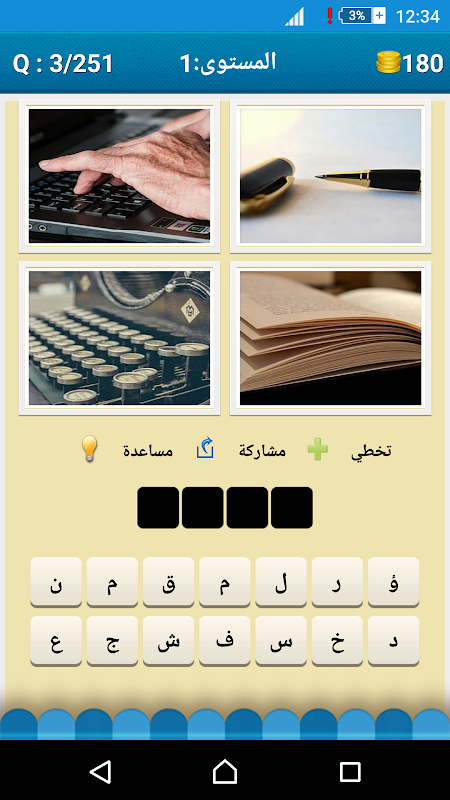 * إضغط دخول و سيتم عرض اللغز المؤلف من أربع صور ومجموعة من الحروف.