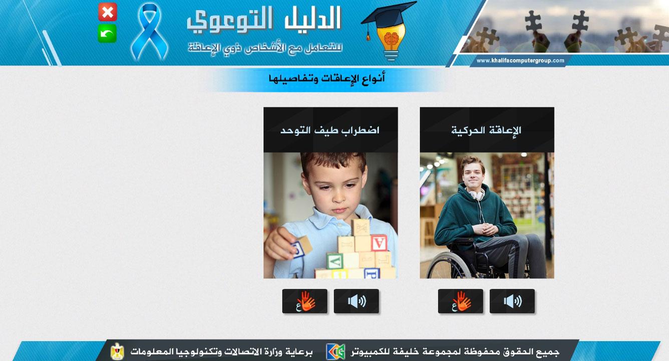 هذا التطبيق متاح بلغة الاشارة للصم وبالصوت للمكفوفين وضعاف السمع حيث يمكن استخدامه من كافة الأشخاص ذوي الاعاقة