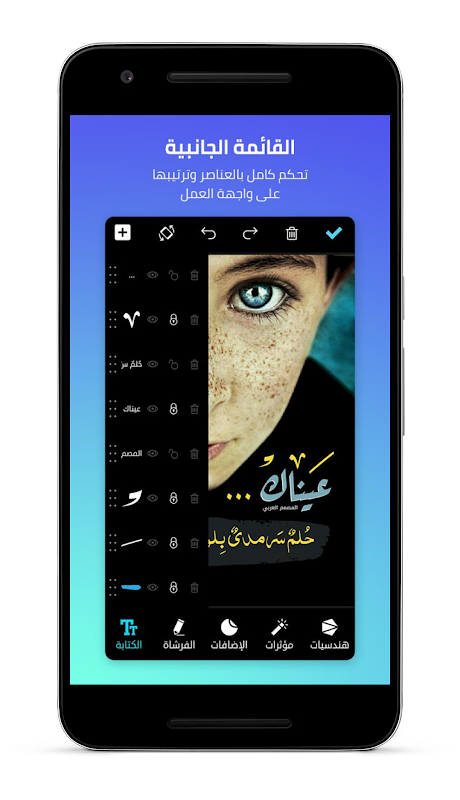 ستجد في تطبيق Arabic designer كل الأدوات التي تحتاجها من أجل إضافة النصوص إلى كل صورة من الصور بطريقة سهلة للغاية. ستكون هنا قادرا على تعديل اللون ونوع الخط من أجل جعل كل صورة من الصور التي تلتقطها على هاتفك مثيرة ومتميزة.