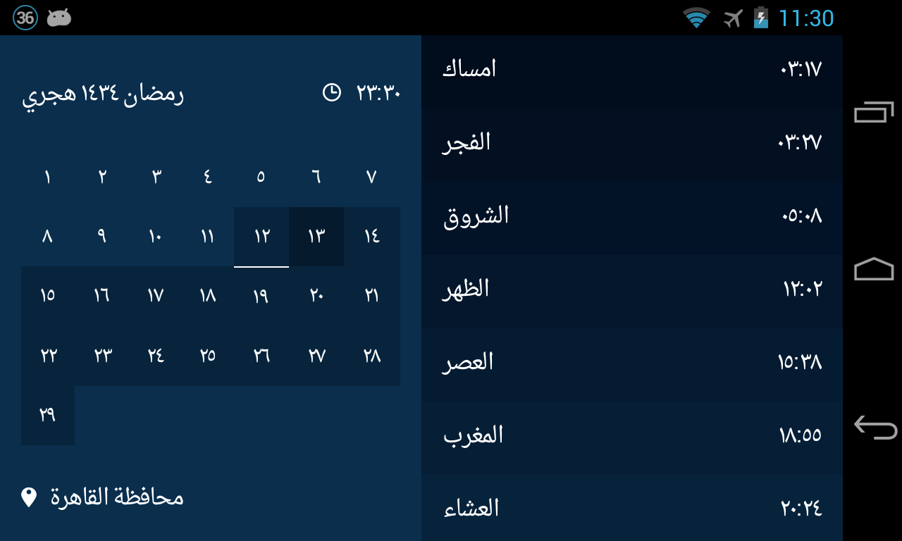 بمجرد ان تميل الجهاز سوف تستطيع ان تري كل اوقات الصلوات و الامساك في جميع ايام الشهر الفضيل (شهر رمضان الكريم)