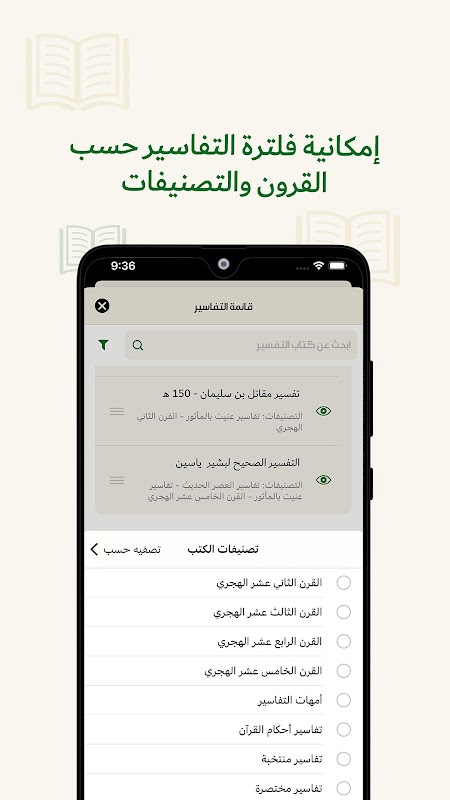 आवेदन आपको व्याख्या की 100 से अधिक प्रमुख पुस्तकों को ब्राउज़ करने की अनुमति देता है, और 50 से अधिक भाषाओं में नोबल कुरआन के अर्थों के अनुवाद के संग्रह के साथ सूरा और पद्य द्वारा उनकी सामग्री की तुलना करता है।
