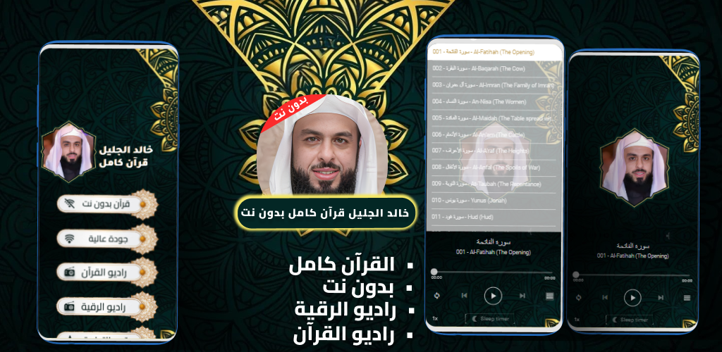 "खालिद अल-जलील द्वारा इंटरनेट के बिना संपूर्ण कुरान" एप्लिकेशन उन उपयोगकर्ताओं के लिए एक उत्कृष्ट विकल्प है जो खालिद अल-जलील द्वारा सुनाई गई पवित्र कुरान को किसी भी समय और बिना इंटरनेट कनेक्शन के सुनने का एक अनूठा अनुभव चाहते हैं। यह एप्लिकेशन विभिन्न सूरहों, जैसे सूरह अल-बक़रा, अल-कहफ़ और अल-मुल्क तक आसान और त्वरित पहुँच प्रदान करता है, जिससे उपयोगकर्ताओं को इन सूरहों का पाठ आसानी और आराम से सुनने का अवसर मिलता है। इसके अतिरिक्त, यह एप्लिकेशन खालिद अल-जलील द्वारा सुनाई गई पवित्र कुरान के रेडियो प्रसारण को सीधे सुनने की सुविधा भी प्रदान करता है, जिससे उपयोगकर्ता पाठ की सुंदरता का आनंद ले सकते हैं। वैध रुक़्या की तलाश करने वालों के लिए, यह एप्लिकेशन उसी सहजता और आराम से रुक़्या सुनने की सुविधा भी प्रदान करता है। इसके अलावा, यह एप्लिकेशन सुविधाजनक वॉल्यूम नियंत्रण और एक निश्चित अवधि के बाद पॉज़ मोड को चालू करने की सुविधा प्रदान करता है, जिससे खालिद अल-जलील द्वारा सुनाई गई पवित्र कुरान को सुनने का अनुभव अधिक आरामदायक और व्यवस्थित हो जाता है। "खालिद अल-जलील बिना इंटरनेट" एप्लिकेशन उन लोगों के लिए एक आदर्श समाधान है जो खालिद अल-जलील द्वारा सुनाई गई पवित्र कुरान को किसी भी समय और बिना इंटरनेट कनेक्शन की परेशानी के सुनना चाहते हैं।