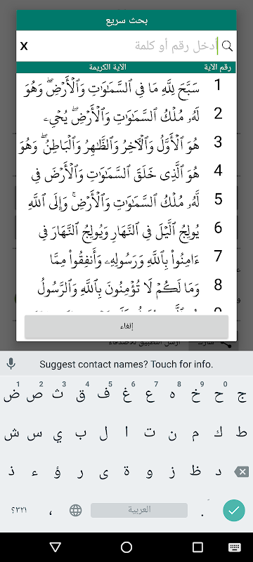 बुजुर्गों और दृष्टिबाधित लोगों के लिए मोबाइल उपकरणों से पढ़ने की सुविधा के लिए बड़ी लिखावट में सूरत अल-हदीद का अनुप्रयोग। एप्लिकेशन उथमानी लिपि में कुरान पाठ को प्रदर्शित करता है, जो पैगंबर के शहर के कुरान के समान है, बड़ी, स्पष्ट लिखावट में। एप्लिकेशन किसी शब्द की खोज करके या पद्य संख्या के आधार पर खोज कर सीधे पवित्र श्लोक तक जाने की त्वरित खोज की भी अनुमति देता है।