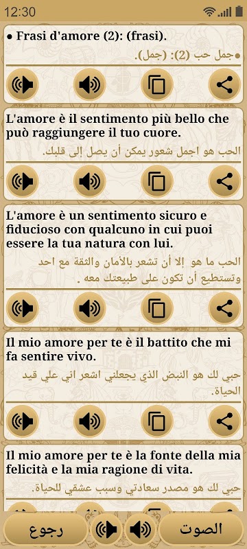 يدعم التطبيق ميزة "تحويل النص إلى كلام" وبالتالي يمكنك تعلم الإيطالية بالصوت, وأيضاً يتضمن خاصية الإشعارات "Notifications" والشاشات المصغرة "Widgets" والتي تعرض في كل يوم جملة جديدة.