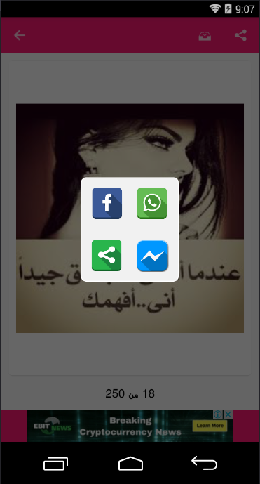 إمكانية مشاركة الصورة من التطبيق إلى أحد مواقع التواصل الاجتماعي كالفيسبوك أو إرسالها إلى أحد الأصدقاء كمسج على المسنجر.