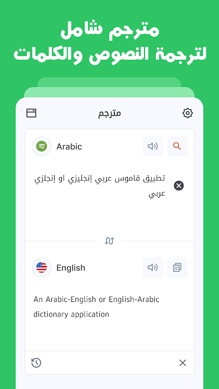 इसके अलावा, शब्दकोश में अंग्रेजी में शब्दों के लिए एक वक्ता होता है। इसमें अंग्रेजी और अरबी में 90,000 से अधिक सामान्य शब्द शामिल हैं जो आपको बुनियादी दैनिक ग्रंथों का अनुवाद करने में मदद करते हैं