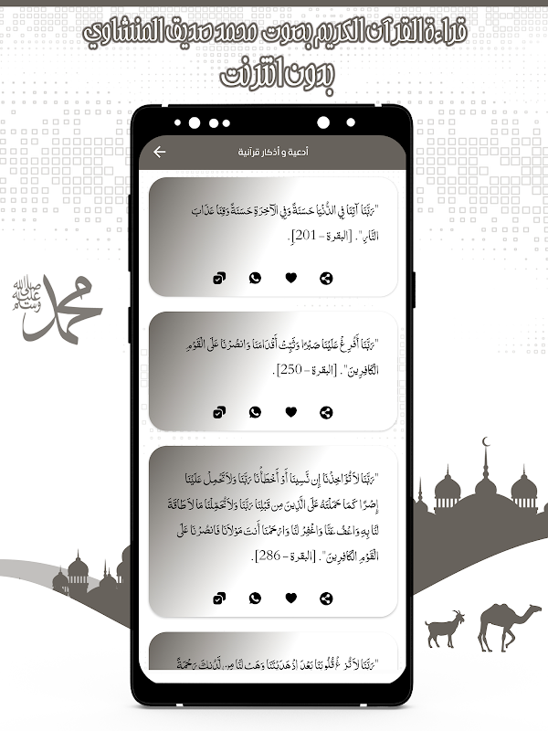 और अगर आप कुरान को पढ़ने में शेख मुहम्मद सिद्दीक अल-मिनशावी को सुनने के प्रशंसक हैं, तो मुहम्मद सिद्दीक अल-मिनशावी की आवाज में नोबल कुरान का आवेदन आपको नोबल कुर के सूरह सुनने की सुविधा प्रदान करता है। मुहम्मद सिद्दीक अल-मिनशावी एमपी 3 की आवाज में मुफ्त में।