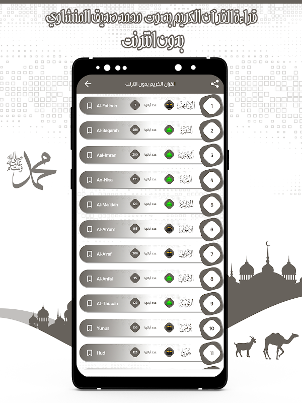 मुहम्मद सिद्दीक अल-मिनशावी की आवाज के साथ नोबल कुरान का आवेदन। आप अपने मोबाइल फोन या टैबलेट के माध्यम से नोबल कुरान के सभी सुरों को आसानी से और आसानी से एक कार्यक्रम के माध्यम से सुन सकते हैं जिसमें नोबल कुरान के सभी सूरह शामिल हैं, और कुरान पाठ आवेदन मुहम्मद सिद्दीक की आवाज की विशेषता है अल-मिनशावी एंड्रॉइड फोन के लिए स्टोर पर मुफ्त और उपलब्ध है। आप जहां चाहें शेख मुहम्मद सिद्दीक अल-मिनशावी की आवाज के साथ नोबल कुरान का पाठ करने का आनंद लेने के लिए।
