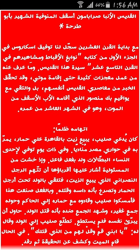 يساعدك هذا ال APP علي زيادة معلوماتك عن قصص القديسين و يحكي لك القصص باسلوب سهل و مميز. و تم برمجة هذا التطبيق بواسطة بيمن بولس نجيب في الصف السادس الابتذائي من كنيسة مارجرجس شبين القناطر.