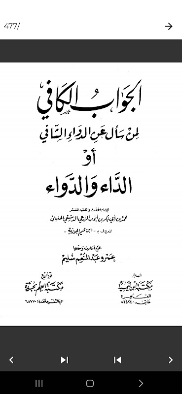 यह एप्लिकेशन आपको इब्न अल-क़य्यिम की पुस्तक द डिजीज एंड मेडिसिन के अलावा, इलाज के बारे में पूछने वालों के लिए पर्याप्त उत्तर पुस्तक प्रदान करता है।