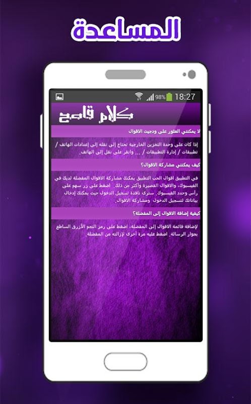 تطبيق كلام قاصح يحتوي على منشورات وحالات، عبارات، منشورات وستاتيات وحالات مغربية خطيرة يمكن مشاركتها مع الأصدقاء على جميع التطبيقات مثل Facebook، WhatsApp، SMS، Google+، سنبشات وغيرها...