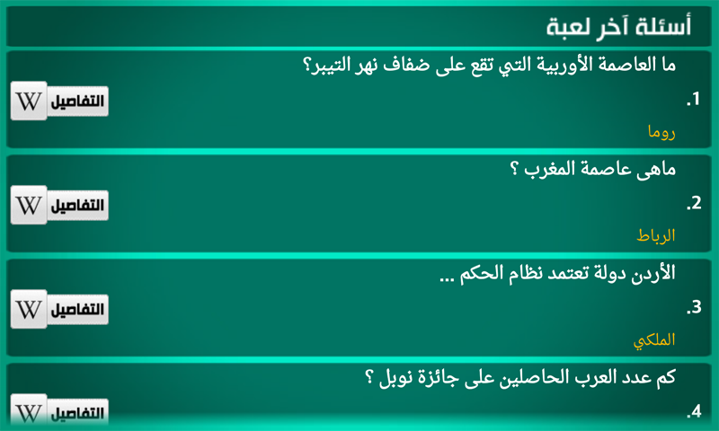- إمكانية مراجعة جميع أسئلة آخر لعبة و أجوبتها و قراءة معلومات و تفاصيل إضافية متعلقة بالسؤال ( لقراءة المعلومات الإضافية يجب أن تتوفر على إتصال بالنت)