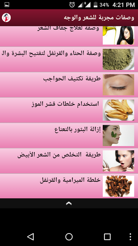 وصفات مجربة للشعر والوجه تطبيق مجاني ومتجدد يحتوي على مجموعة كبيرة من الوصفات المجربة لكل فتاة تحلم بشعر فائق الجمال.