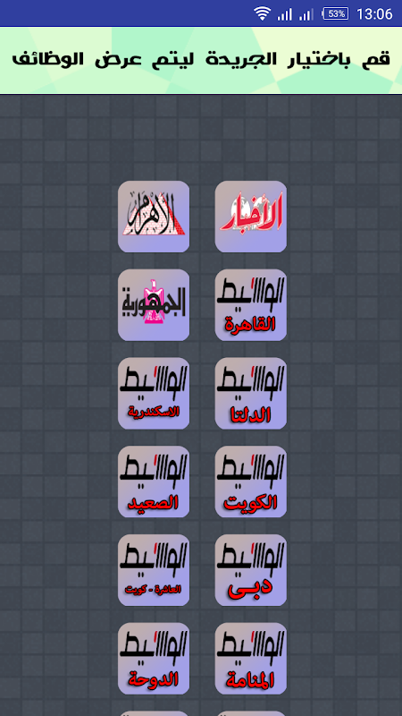 تطبيق سهل الاستخدام يعرض اعلانات الوظائف الخالية من الصحف المصرية والعربية مثل جريدة الاخبار المصرية وجريدة الاهرام وجريدة الجمهورية كذلك وظائف من جريدة الوسيط او جريدة الوسيلة كما يطلق عليها فى المملكة العربية السعودية.