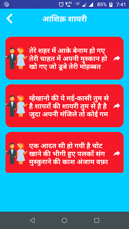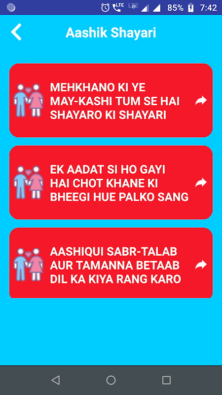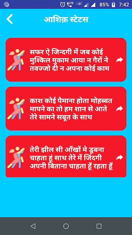 We display Aashiq Shayari Status that will make you feel good environment around you while you are viewing messages. This app has a very simple and user friendly Interface.