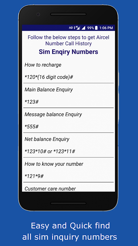 This App provides the details of various operators sim inquiry numbers and kisi bhi number ki call history kaise nikale ?