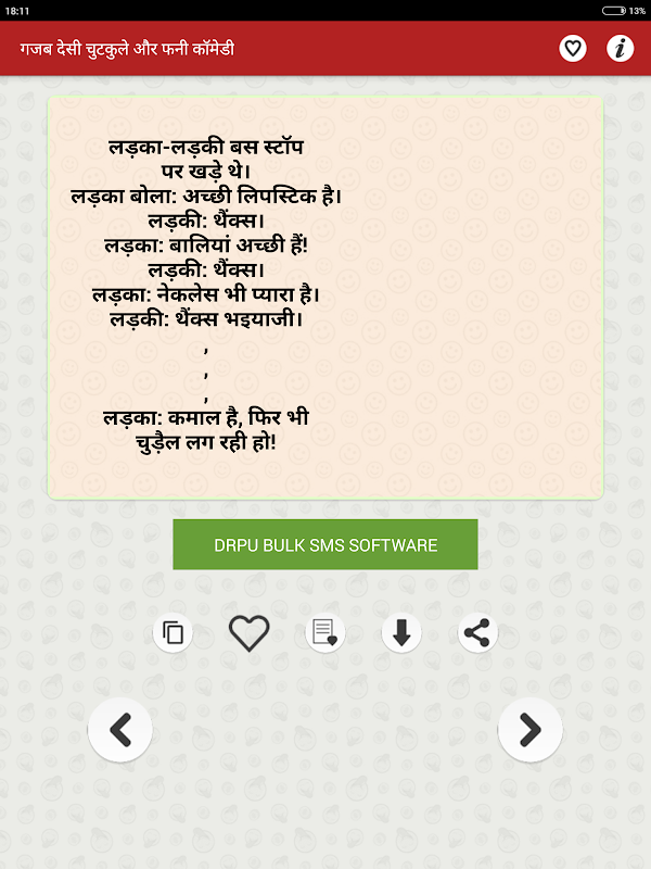 शीर्ष सबसे मजेदार और मनोरंजन हिंदी चुटकुलों का संग्रह जिसे आप सोशल नेटवर्किंग साइटों पर अपने दोस्तों और परिवार के सदस्यों के साथ साझा करने का आनंद ले सकते हैं। आप सोशल मीडिया वेबसाइटों जैसे फेसबुक इंस्टाग्राम ट्विटर लिंक्डइन आदि पर केवल एक टैप से शेयर या किसी भी चुटकुले को डाउनलोड कर सकते हैं और साथ ही चैट मैसेंजर जैसे व्हाट्सएप स्नैपचैट हाइक आदि पर भी चुटकुलों को टेक्स्ट या जेपीजी में चित्र के रूप में सहेज सकते हैं या अपने मोबाइल फोन की आंतरिक मेमोरी या अपने सेल फोन एसडी कार्ड में PNG फॉर्मेट करें और बाद में फोटो के रूप में साझा कर सकते हैं।