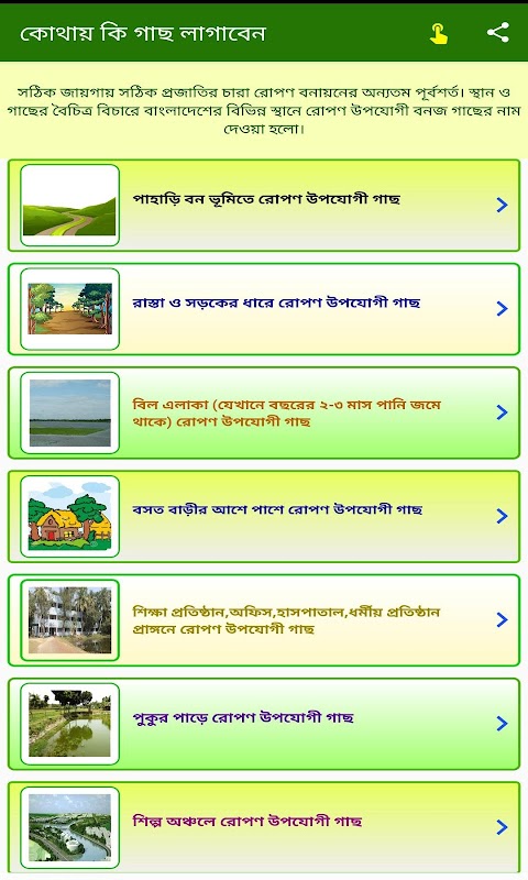 सही जगह पर सही प्रजाति के पौधे लगाना रोपण के लिए आवश्यक शर्तों में से एक है। इस मोबाइल एप्लिकेशन में, बांग्लादेश के विभिन्न स्थानों में रोपण के लिए उपयोग किए जाने वाले वन वृक्षों के नाम इस आवेदन में शामिल किए गए हैं।