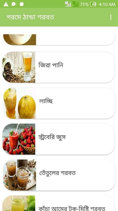 গনগনে গরমে কনকনে ঠান্ডা শরবতের মজাই আলাদা। গরমে এক গ্লাস ঠাণ্ডা পানি যদি শরীর জুড়িয়ে দিতে পারে তবে এক গ্লাস শরবত যে মন ভরিয়ে দেবে তা নিঃসন্দেহে বলা যায়। গরমে এখন প্রাণ জুড়িয়ে দিতে পারে ঠান্ডা এক গ্লাস শরবত। বাড়িতে সহজে বানিয়ে নিতে পারবেন এমন ২৫ টি শরবতের রেসিপি দিয়ে আমাদের এই এপস টি সাজান হয়েছে । আমাদের শরবত রেসিপি গুলা হলো -বেলের শরবত,