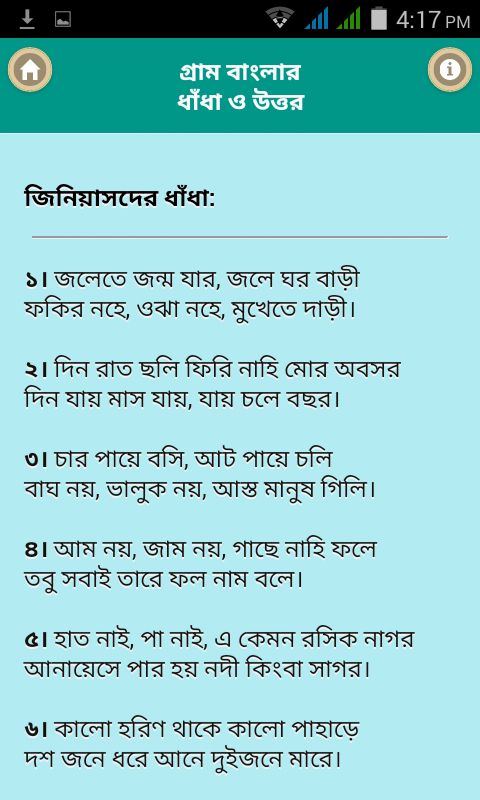এমন কোন মানুষ খুঁজে পাওয়া যাবে না যে মজা করতে পছন্দ করে না। গ্রাম বাংলাতে ধাঁধার প্রশ্ন ও উত্তরের মাধ্যমে মজা করার প্রচলন অনেক দিনের। আমাদের এই অ্যাপ এ রয়েছে কিছু গ্রাম বাংলার সাড়াজাগানো ধাঁধার প্রশ্ন ও উত্তর।
